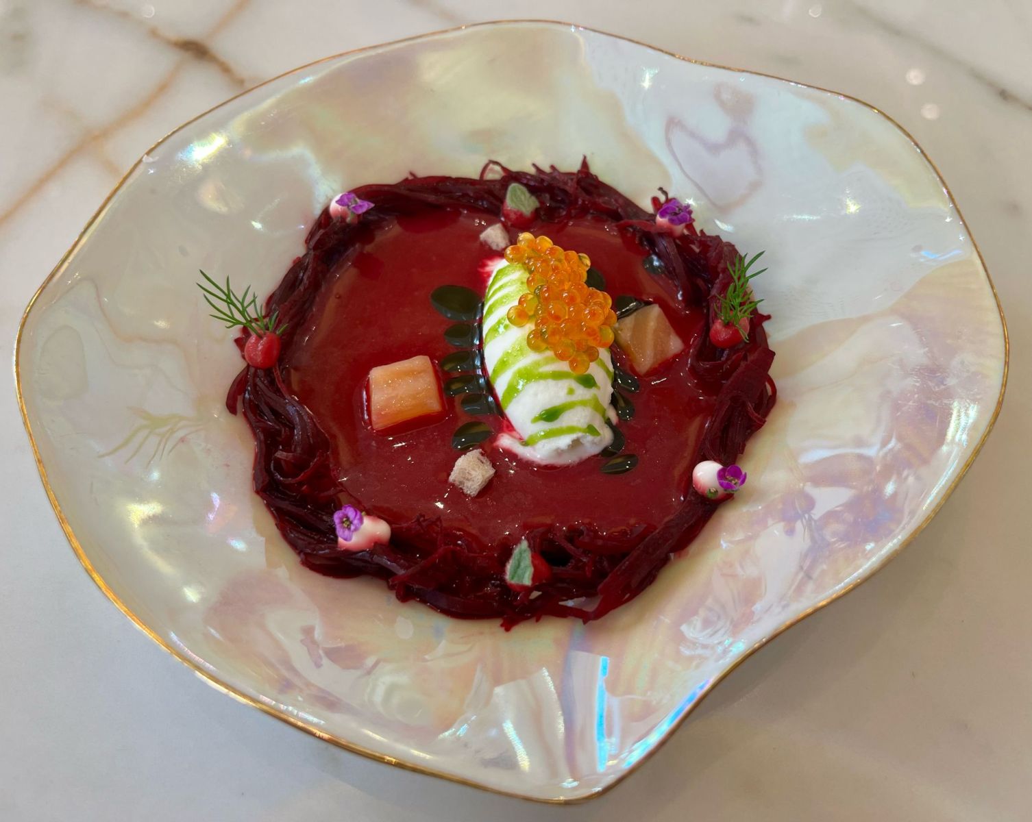 - Sopa fría de remolacha y eneldo, Kéfil helado y salmón: Una explosión de frescura y sabor en cada cucharada.
