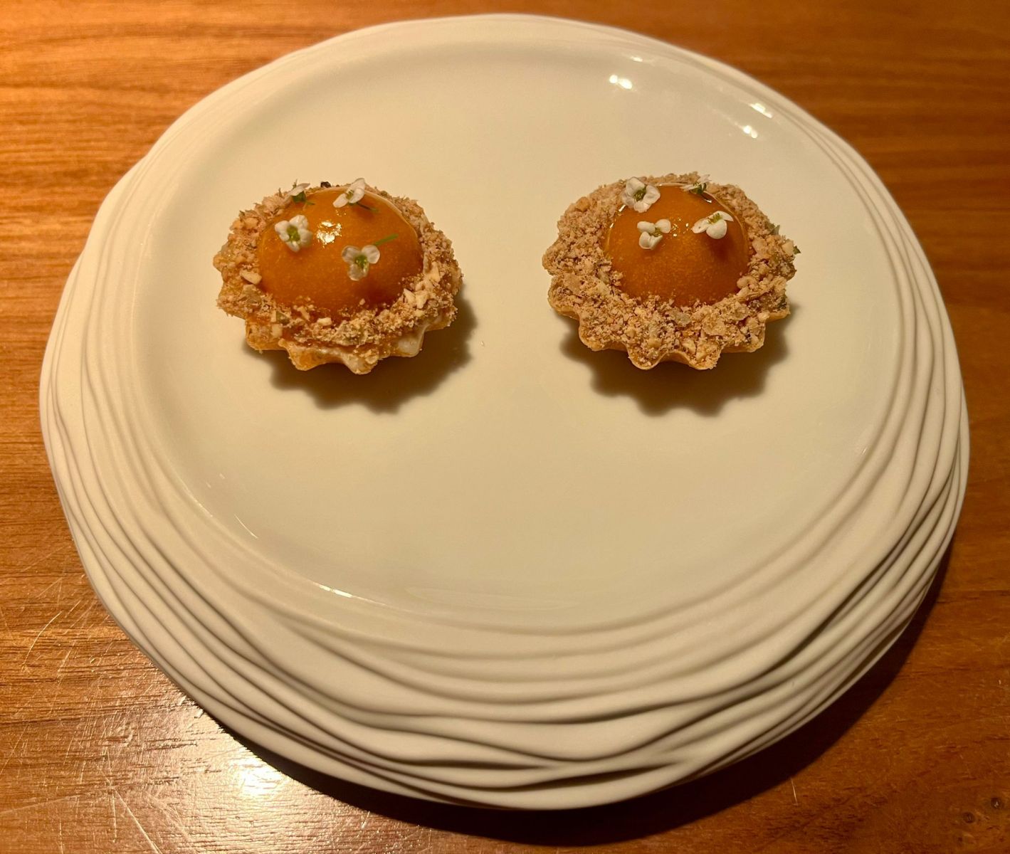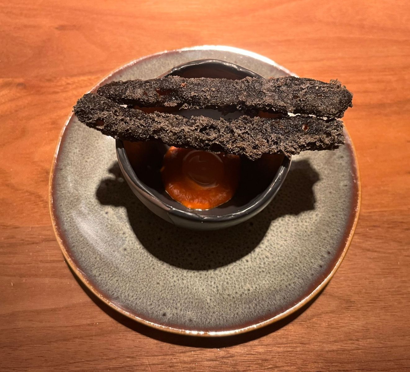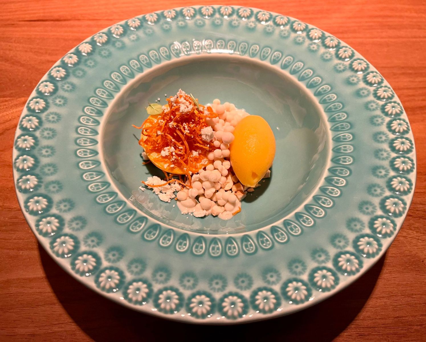 • Batata Doce, clementina, gengibre, caju → Un postre en el que la suavidad de la batata dulce se equilibraba con la acidez de la clementina, el toque especiado del jengibre y el crujiente de los anacardos.