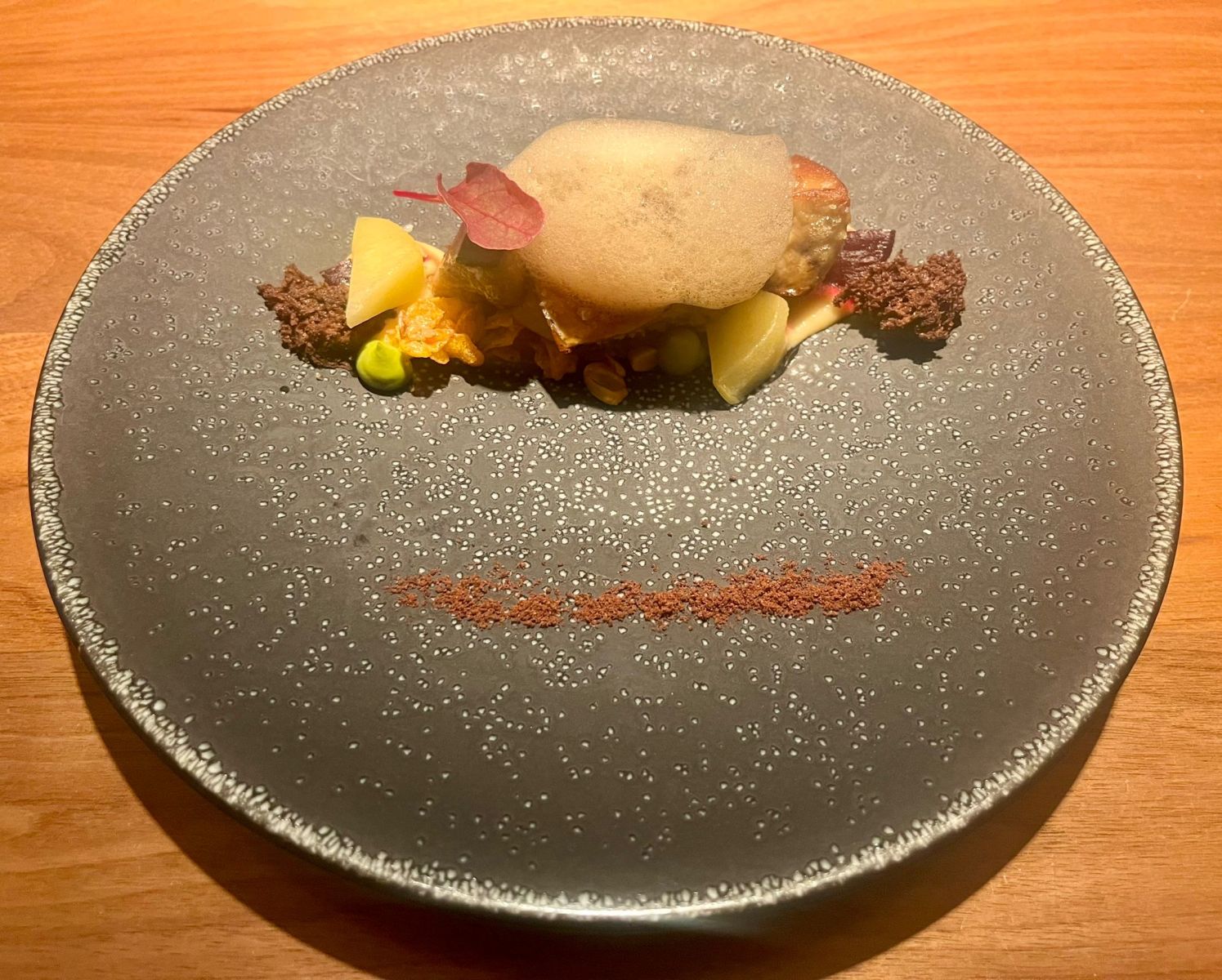 • Foie Gras, maçã, granola, beterraba, café → Un plato de contrastes: la intensidad del foie gras, el frescor de la manzana, la textura crujiente de la granola, el dulzor terroso de la remolacha y el sutil amargor del café.