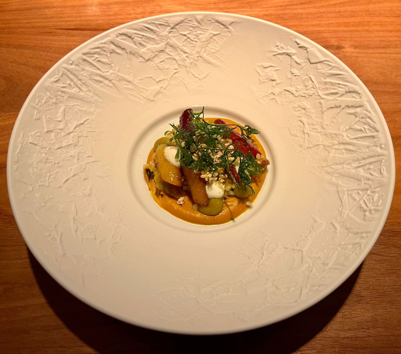 • Cenouras, bulgur, puré de alperce, queijo de cabra → La humilde zanahoria transformada en un plato vibrante, con la textura del bulgur, el dulzor del albaricoque y el contraste del queso de cabra.