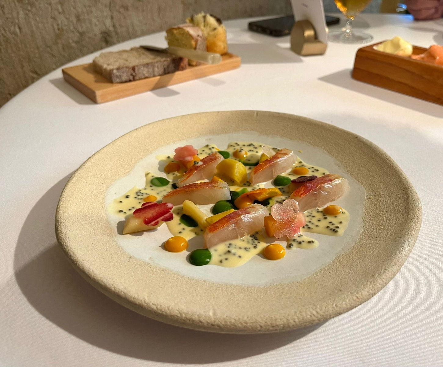 • Cured hamachi from the Azores, dashi of caldeirada, grilled young onion tempura → El hamachi de las Azores, curado con precisión, realzado por un caldo dashi de caldeirada y la textura crujiente de la tempura de cebolla joven.