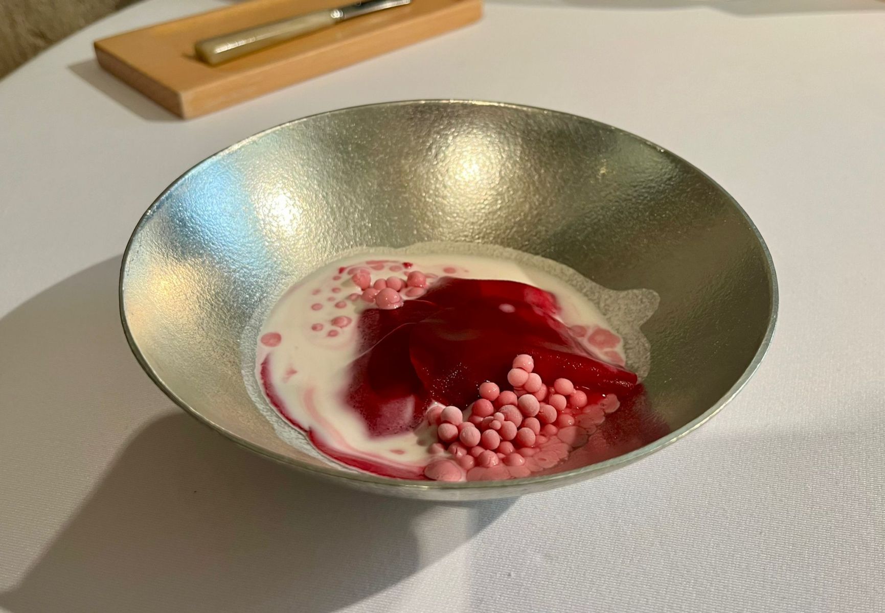 • Beetroot in different textures, pine nut milk and mustard seeds → La remolacha como protagonista en un plato que jugaba con diversas texturas y matices, complementada con leche de piñones y semillas de mostaza.