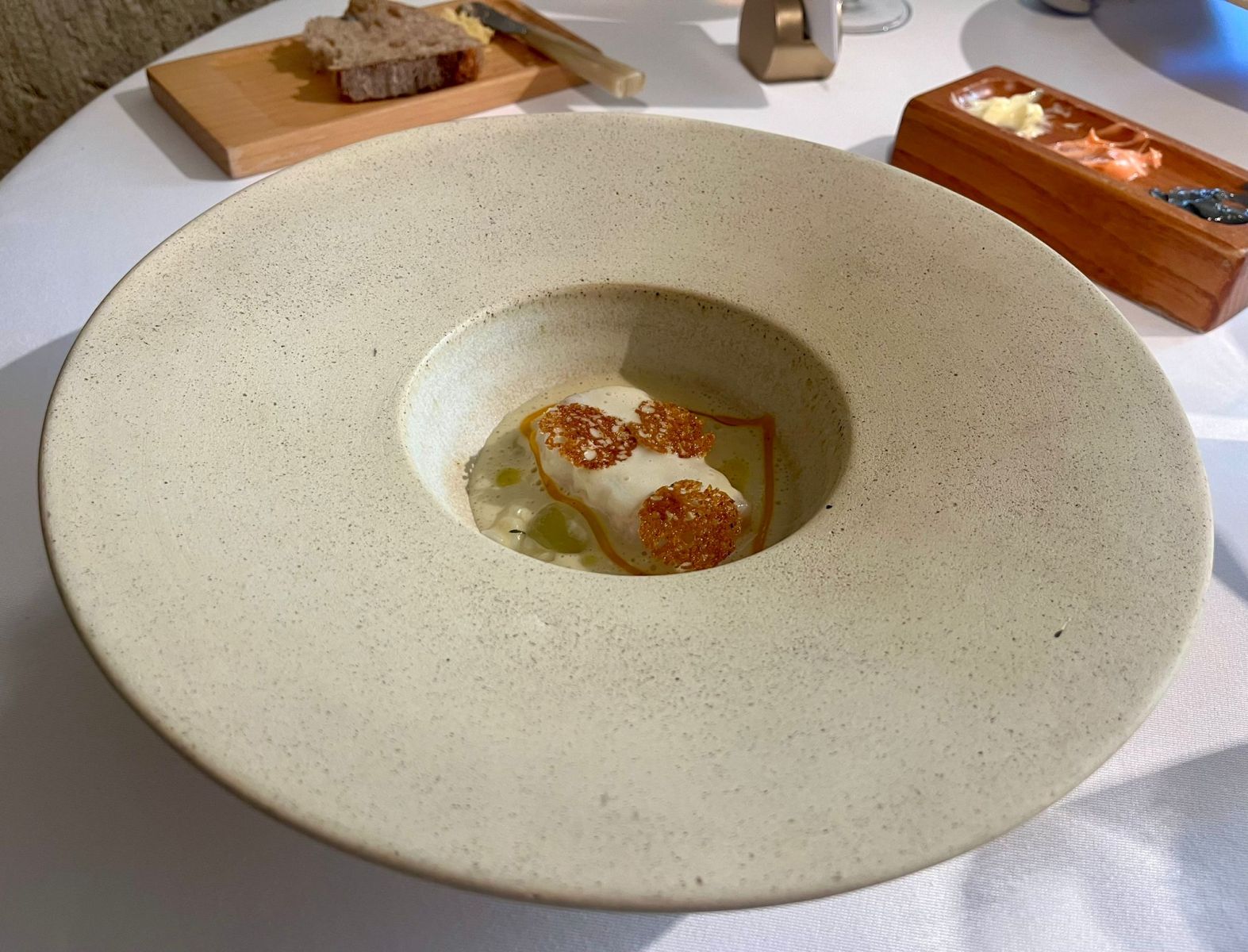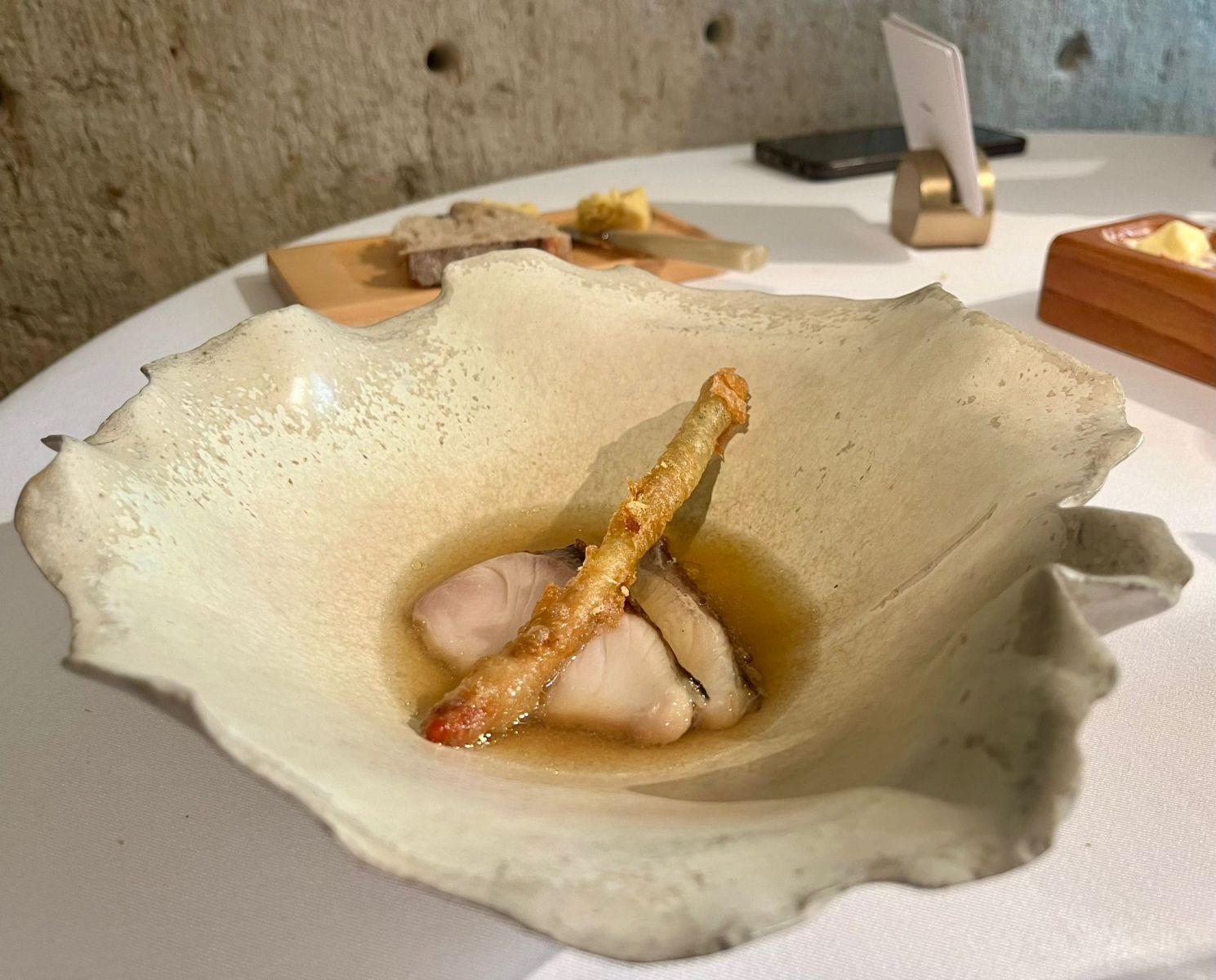 • Cured hamachi from the Azores, dashi of caldeirada, grilled young onion tempura → El hamachi de las Azores, curado con precisión, realzado por un caldo dashi de caldeirada y la textura crujiente de la tempura de cebolla joven.