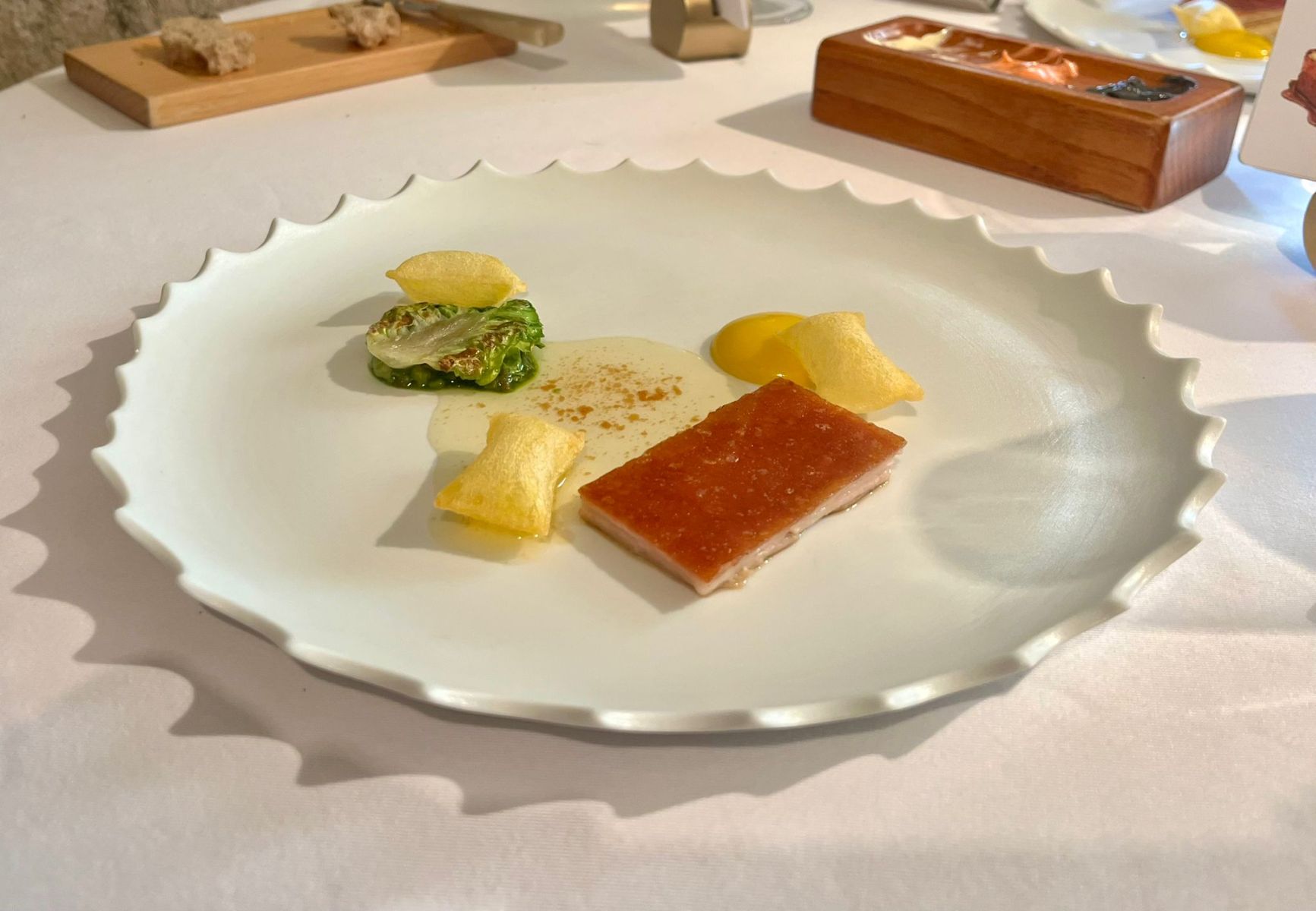 • Grilled hake and cod’s swim bladder stew → La merluza a la parrilla se complementaba con un sorprendente guiso de vejiga natatoria de bacalao, un ingrediente poco común que aportaba una textura sedosa.