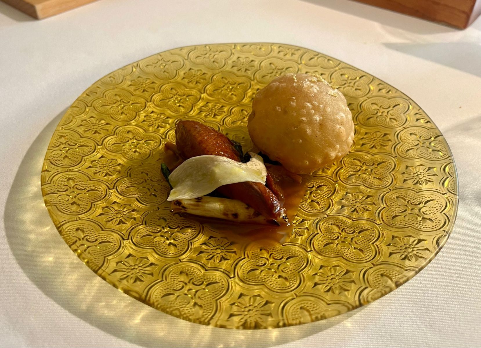 • Golden sphere, partridge escabeche and foie gras → Una esfera dorada que al romperse revelaba un interior de escabeche de perdiz y foie gras.