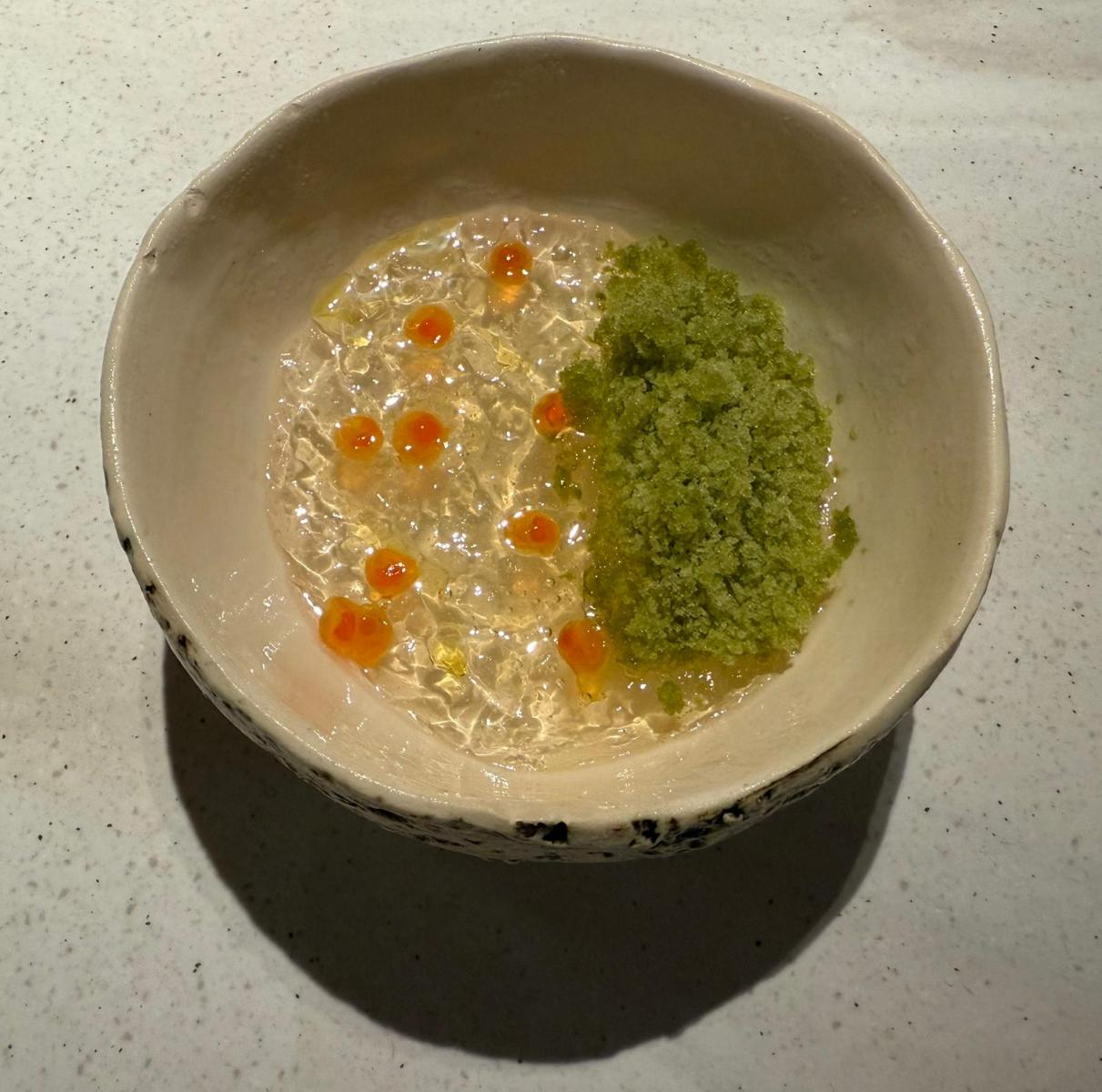 - Agua de tomate, huevas de salmón y granizado de hierbas