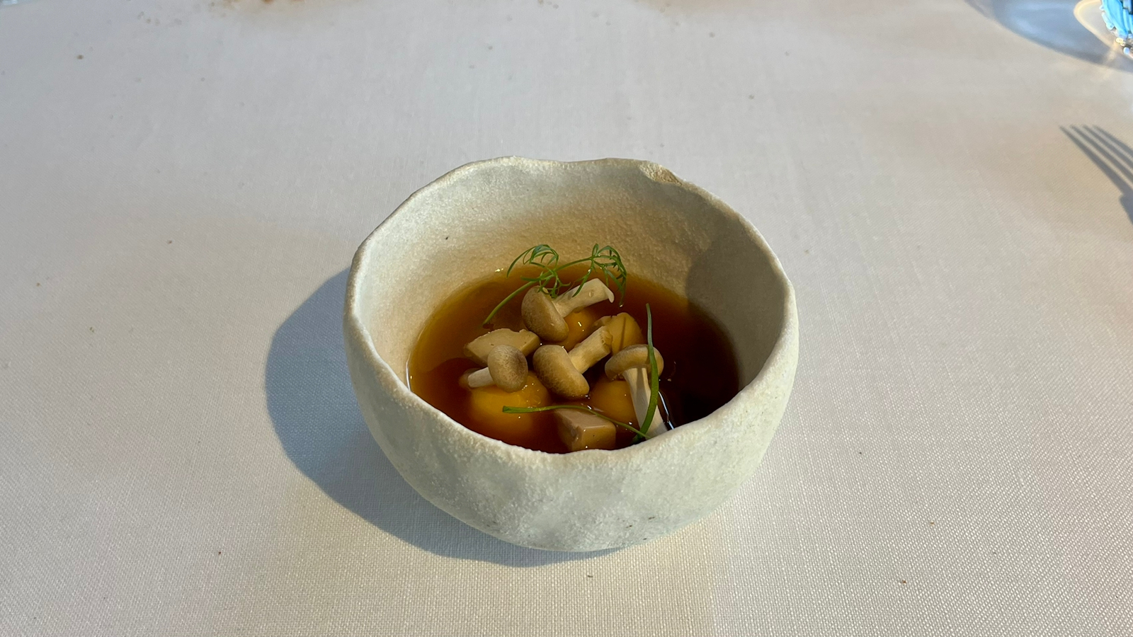 - Un magnífico e sabrosísimo «Xugo de cogumelos tostados, xema de trufa e foie-gras»: un prato complexo e sofisticado que era unha auténtica delicia.